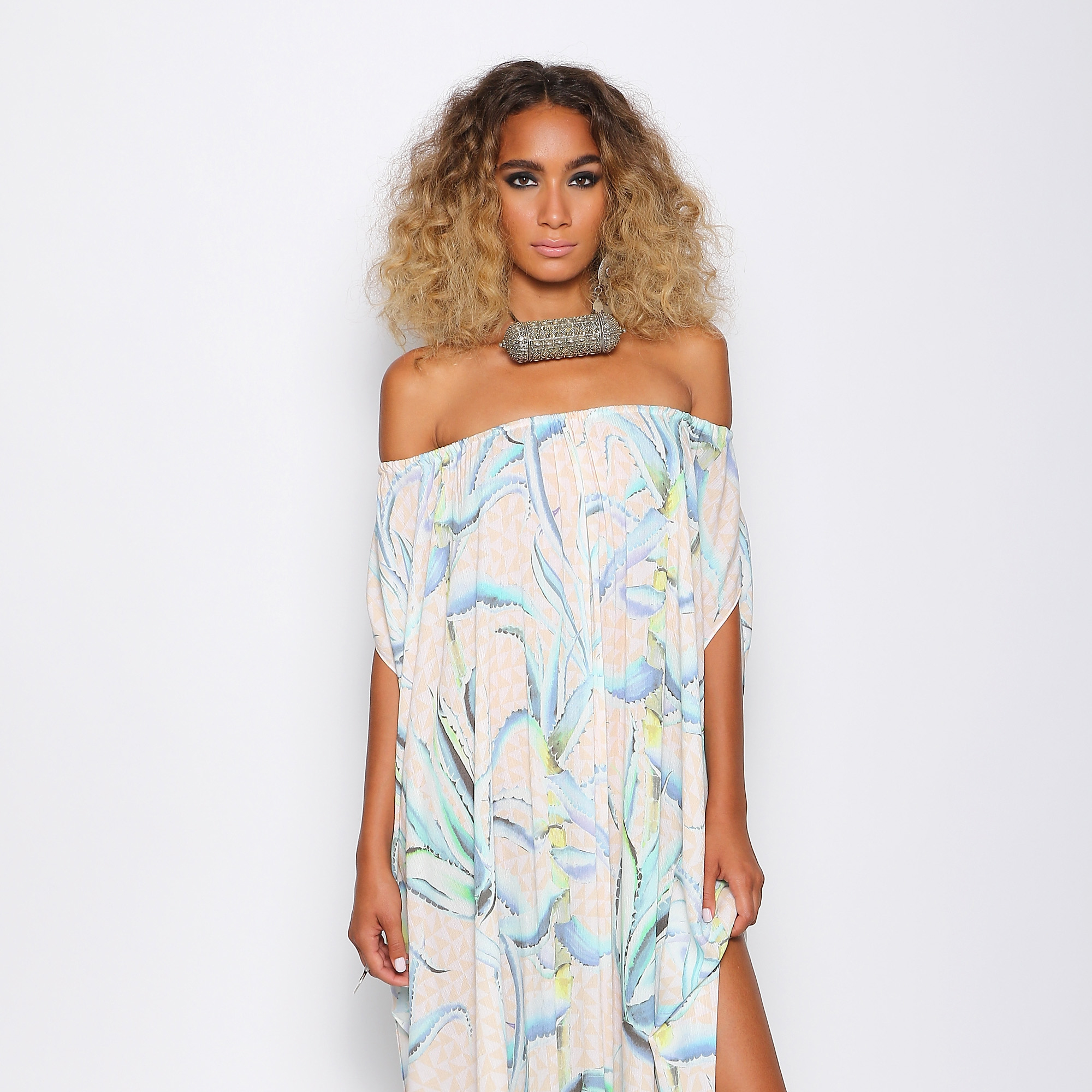 To complement the collection’s Moroccan-inspired style, TRESemmé Stylist Tyler Laswell went for textured curls with a ton of volume by using a combo of TRESemmé 24 Hour Body Mousse and TRESemmé Perfectly (un)Done Sea Salt Spray before diffusing and curling. Smouldering charcoal smoky eyes finished off the look.