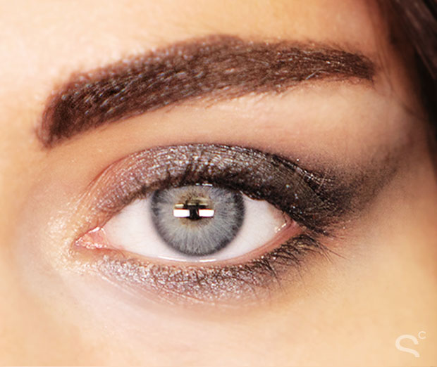 Naked Smoky gives you three perfect silver/gray tones to create a quintessential smoky look. Without going too hard on the smoke, opting to play with texture instead, we ombré’d Slanted, a metallic gunmetal gray into Dagger, the deeper gray with a slight shimmer. Dagger was blended into a dramatic but soft wing shape going outwards, and swooped down to line the lower lashes. We dabbed more of Slanted onto the center of the eyelid as well as the center of the lower lash line to give the look a bit of metallic dimension. When you apply light-reflecting shimmer and gloss to the area of the eye that protrudes the furthest out (like the center of the eyelid) it makes your eyes appear rounder and deeper by dimension.