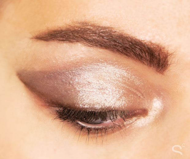 A smoky cat eye is a must with this palette. With a glitter-speckled iridescent cool bronze (or warm silver, depending on how you look at it) shadow like Armor, this takes the classic smudged cat-eye to a new years eve party. Combust, the matte pale rose color was dusted on the entire lid, with Armor blended into the crease and extended into a pointed shape, defining the outer eye corner. Black Market, the deep shimmery black shade, was painted along the lash lines with a flat eyeliner brush and winged out in the outer corners for a smoky cat eye effect.