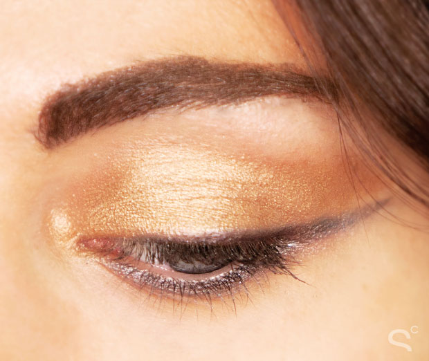 Gold is a flattering shade on most women, and you get three gold and bronze shades in this palette. Brushing the palest gold, Dirtysweet, all over the lid and in the inner corners, we blended medium bronze shade, Radar, from the middle to the outer corner of the eye. Lastly, Whiskey was used again to line the lashes, slightly winging out at the corner for a soft cat-eye.