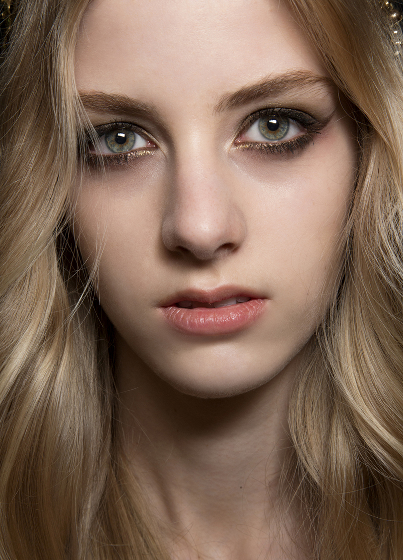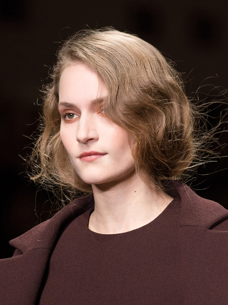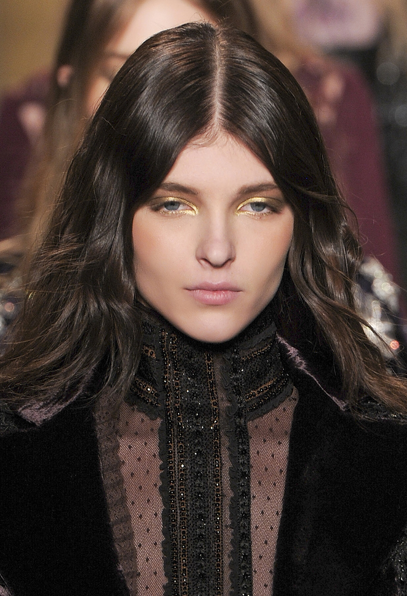 Elie Saab took the cat-eye in a bronze direction, softening the lines with a near-smoky metallic blend of dark and golden bronze makeup. It looks great with the models’ otherwise bare faces and loosely waved hair, but we’re betting this bronzed cat-eye would also look killer paired with a brick red lip for a dramatic nighttime look.
