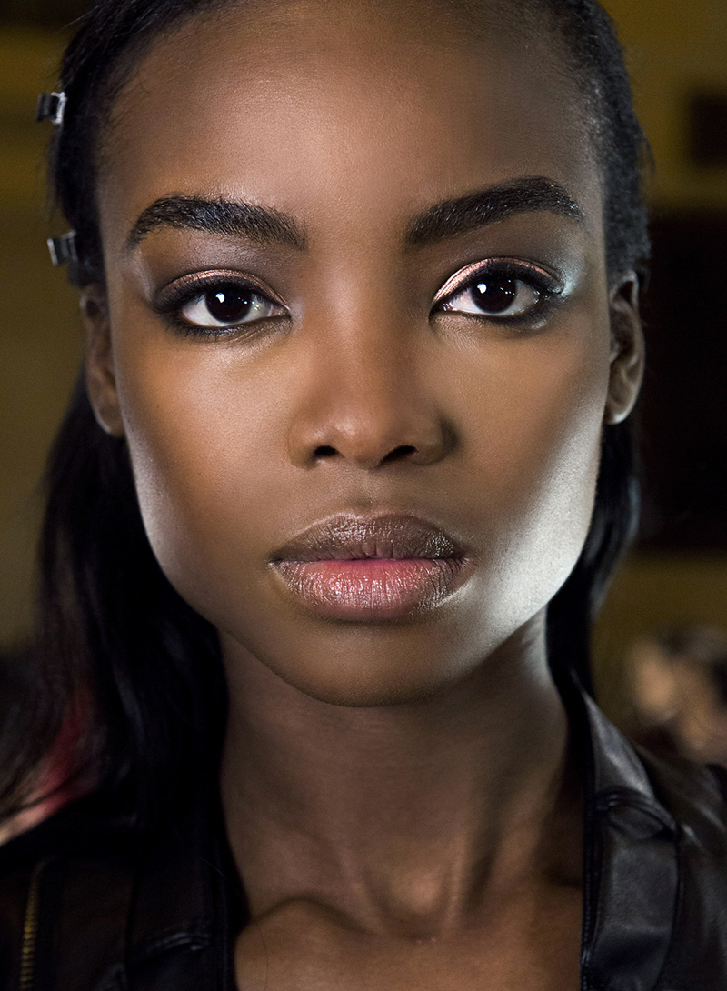 Taking bronze to a deeper level, the eyes at Cividini were all about drama, and perfectly paired with the goth-couture look of the show. Blended softly into and above the crease as well as along the lower lash line, the gleaming look reads more glamorous than sunken.