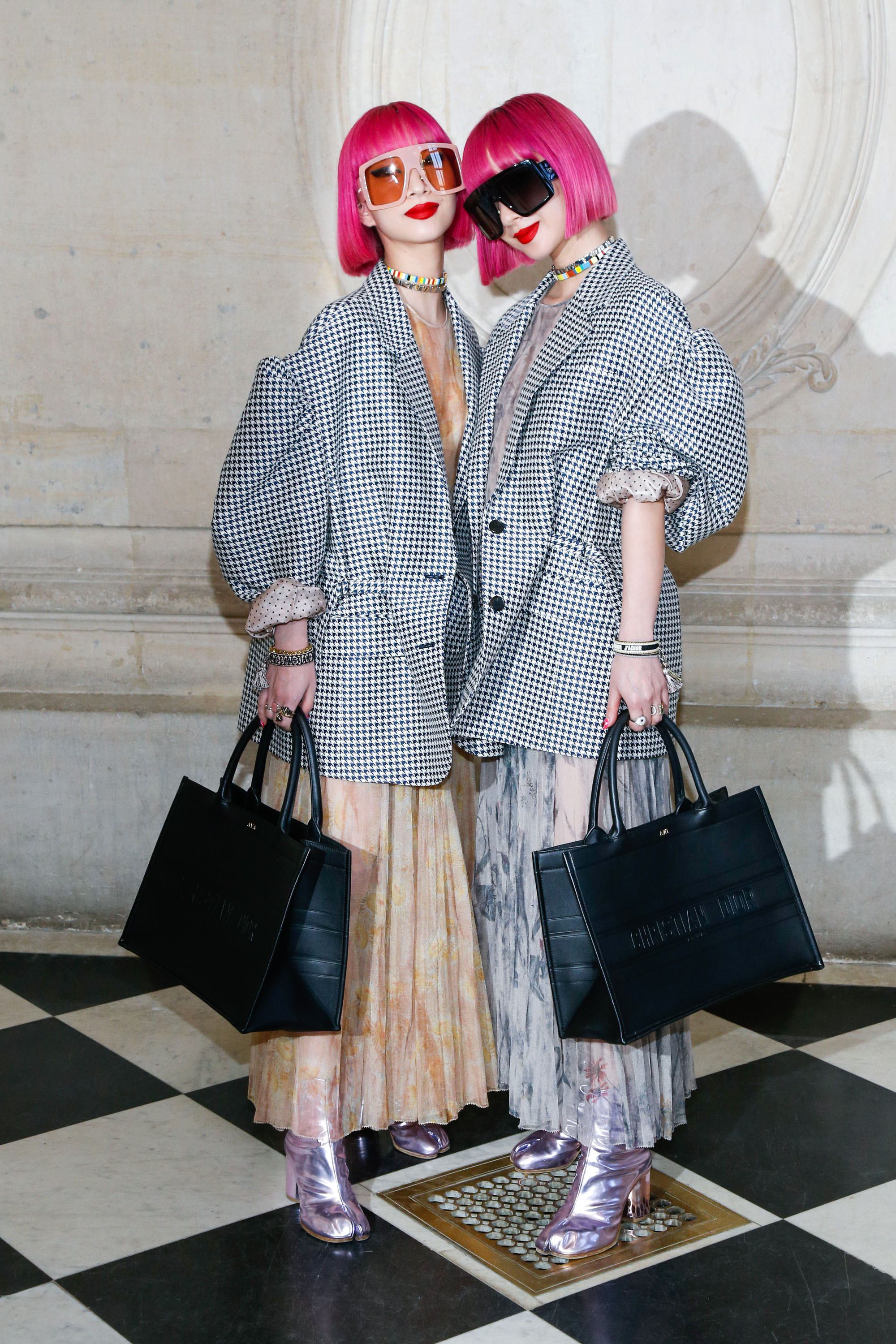Japanese sister musical duo Ami and Aya Suzuki have become two of my favorite people to watch during fashion month. (They’re always matching!) This oversized-gingham-coats-paired-with-metallic-boots look is giving me life.
