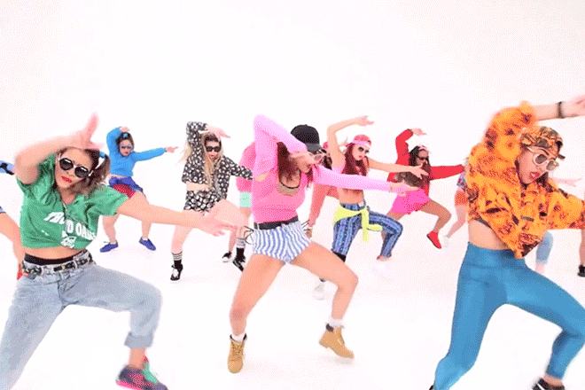 The other admirable thing about this video is that the ladies never. stop. dancing. Not for a second. And I’m not talking little classic moves like the garden sprinkler or the monkey. I’m talking ab-crunching, arm-swinging, thigh-squatting moves that could spawn ridiculous nicknames and engage every muscle you’ve got. I nearly broke an aerobic sweat just watching.