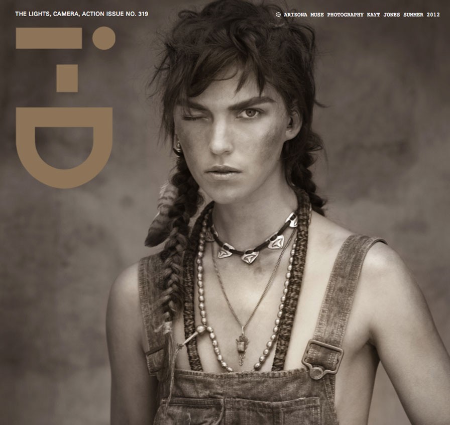 You can check out the full spread in the magazine when it hits newsstands tomorrow, and/or watch this great little fashion film, also shot by Kayt Jones, that has Arizona decked out in some heritage ensembles, razor sharp cheekbones and the always illusive ulta mega crop top that has gone where no crop top has gone before–cut right above the breasticles.