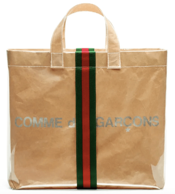 The result is a handbag that combines a strictly Comme des Garçons silhouette with iconic Gucci details: a Comme des Garçons-branded paper bag, covered in clear plastic and lined with Gucci’s go-to red and green stripe.