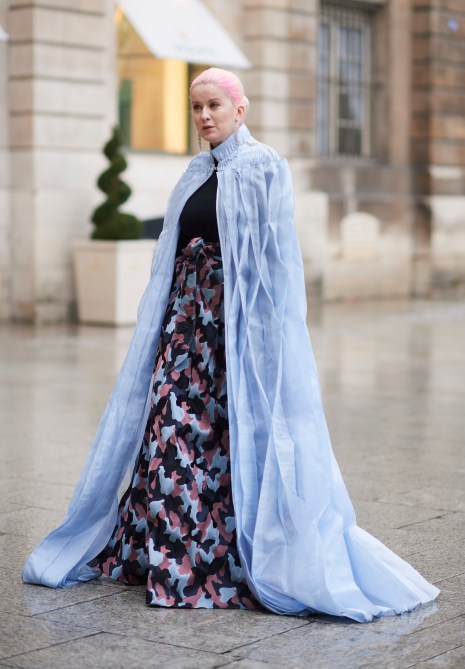 A guest is seen walking the Paris streets in an incredibly dramatic powder blue cape.