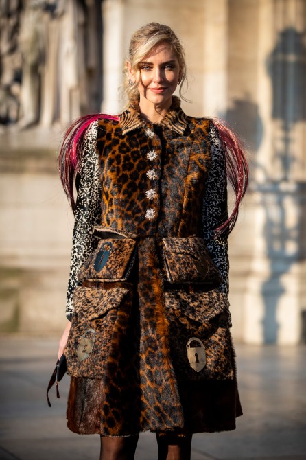 Designer Chiara Ferragni, wearing a leopard print decorated fur coat, is seen outside the Schiaparelli show.