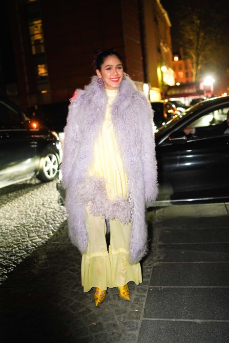 Thai actress and model Araya Hargate wears a pale purple faux fur coat, a yellow dress, earrings, outside Valli, during Paris Couture Fashion Week.
