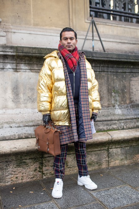 This guest is wearing a gold metallic down coat, plaid scarves and pants and white Fila sneakers outside the Célia Kritharioti show.