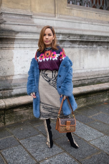 Fashion Consultant Jixxy Kamchoo is seen on the street attending Célia Kritharioti during Paris Couture Fashion Week wearing a blue fur coat, floral knit sweater and carrying a Louis Vuitton bag.