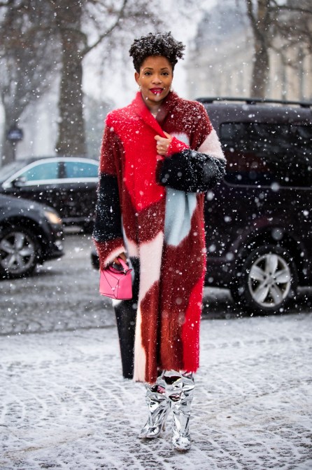A guest, wearing a colorful coat, shiny silver boots and pink Loewe bag, is seen outside Chanel show.