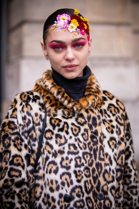 Model Zhenya Katava is seen outside Alexis Mabille show wearing an animal print coat and flowers in her hair.