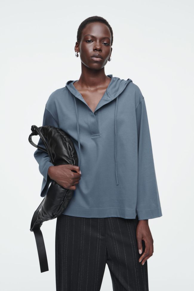 There is more to this hoodie than meets the eye. It’s actually very interesting visually. There’s more of a peasant top-style cut to the hem and the neckline. The neck has buttons, so you can show a little collarbone.