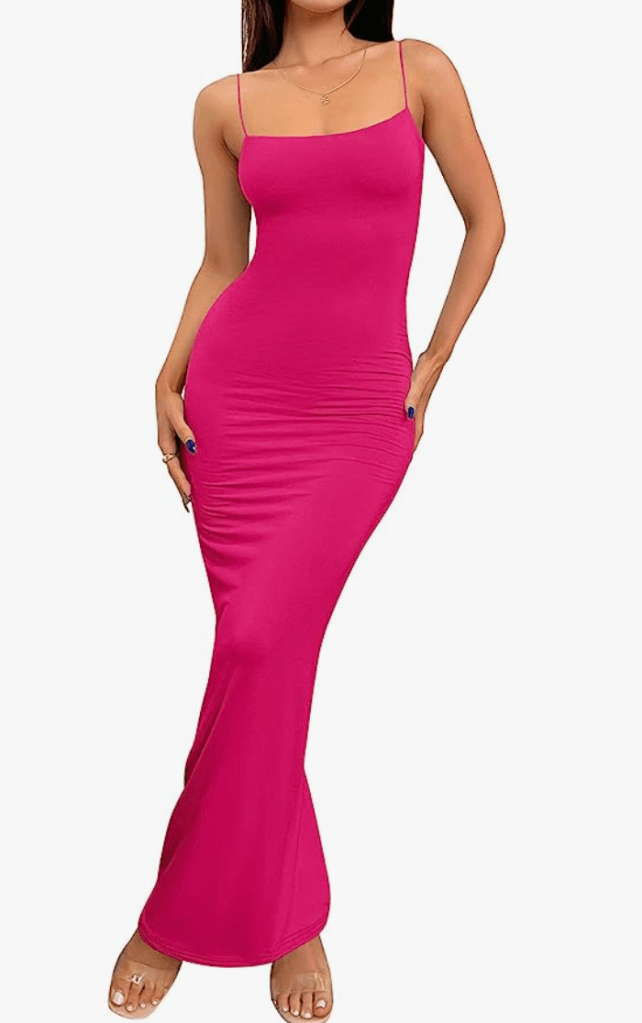 This bodycon maxi dress is a great alternative to the viral Skims dress (which always seems to be sold out). It’s available in 11 different colors and will show off all of your curves. For a classic look, opt for the dress in black—if you want to make a statement, a bright color, like this hot pink, is always a good pick.
