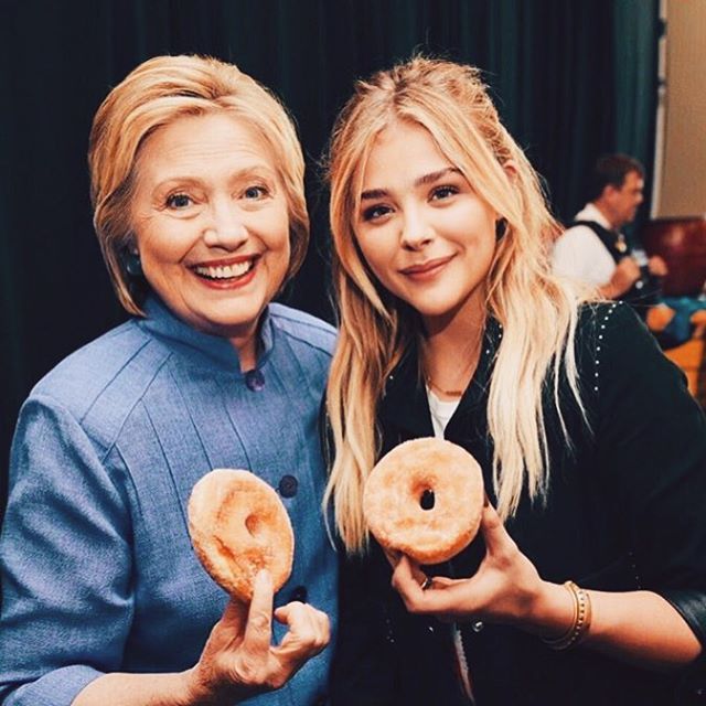 Hillary Clinton and Chloë Grace Moretz pose with doughnuts.