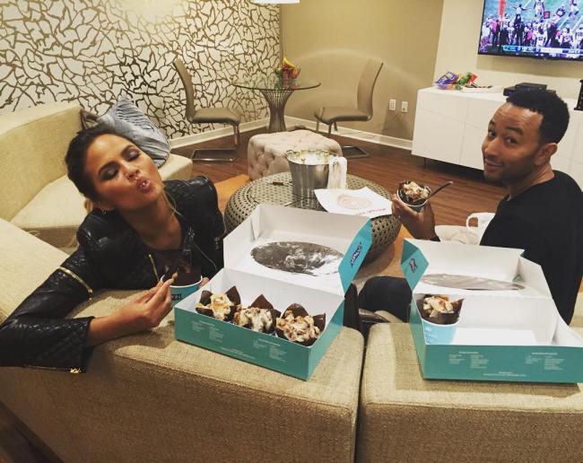 Chrissy Teigen and John Legend chow down on cinnamon rolls. No word if Twitter trolls took issue with this.
