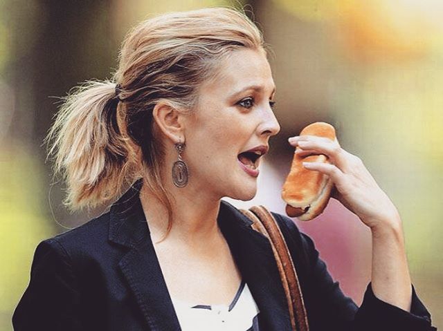 Drew Barrymore takes a bite out of a hot dog.