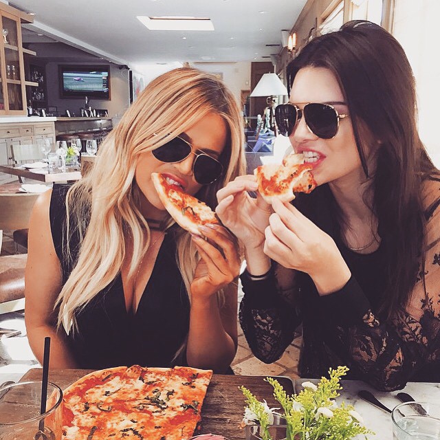 Khloe and Kendall Kardashian “house” a pizza.