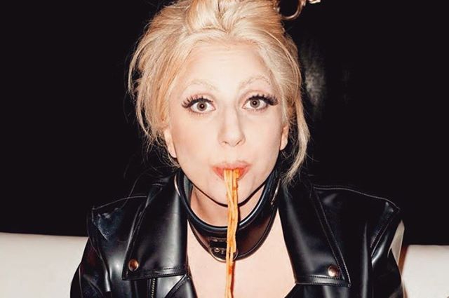 Lady Gaga slurps spaghetti.