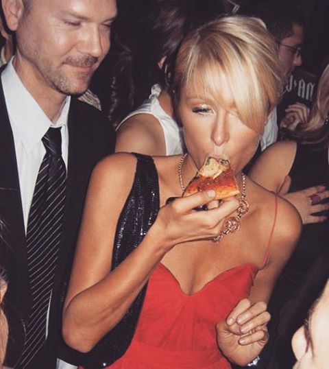 Paris Hilton parties with pizza.