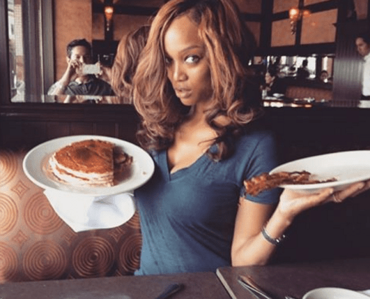 Tyra Banks appears to eat pancakes and bacon at a restaurant.