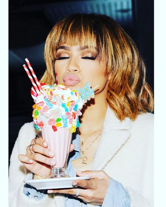 Zendaya air-kisses a huge ice cream sundae.