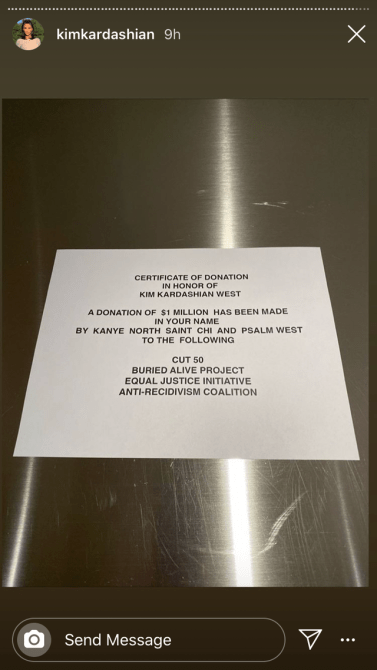 Kardashian spent her birthday weekend with friends in Palm Springs. She, too, received a full room of flowers on her actual birthday. She also had a churro stand and a food truck outside for some delicious dessert. Dessert in the desert, gotta love it. Kardashian’s children made their mom birthday cards and brought the reality star breakfast in bed. She shared a shot of some delicious looking pancakes that spelled the word, “Mom.” But the churro wasn’t the main hit. Neither were the cards—as sweet ass they were. Kardashian’s rapper husband donated $1 million in Kardashian’s name. Kanye listed his four kids, North, Saint, Chicago, and Psalm West, on the donation as well. The donation was made to four criminal justice reform charities—Cut 50, Buried Alive Project, Equal Justice Initiative , and Anti-Recidivism Coalition.
